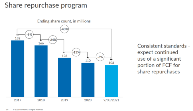 우리는 DaVita가 배당금을 통해 주주들에게 현금을 돌려줬으면 좋겠지만, 회사가 최근 몇 년간 자사주 매입을 통해 유동성을 대폭 줄였다는 점도 존중합니다. 우리는 이를 완만한 수익 성장과 함께 향후 몇 년 동안 중요한 성장 동력으로 보고 있습니다. 버크셔가 5주 중 거의 2주를 소유하고 있는 상황에서 현재 수준의 DaVita 소유 사례는 배당금 혜택 없이도 설득력이 있다고 생각합니다.