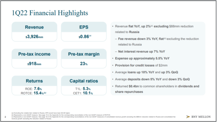 BNY Mellon은 2022년 4월 18일 1분기 실적을 보고했습니다. 주당 수익은 추정치보다 1페니 높은 0.86센트를 기록했습니다. 수익은 전년 대비 2% 증가한 39억 3천만 달러였습니다(러시아 관련 감소 제외). 분기에 수수료 수익은 전체 수익의 80%를 차지했습니다.