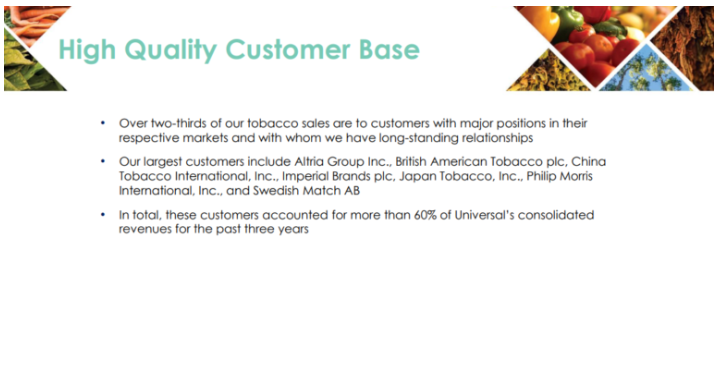 Universal Corporation의 연간 수익 중 거의 4분의 3은 일반적으로 이러한 고객으로부터 나옵니다. 해당 부문에서 가장 큰 이름을 고객으로 세는 것은 대부분의 수익을 신뢰할 수 있음을 의미합니다. 이는 회사에 약간의 안정성을 제공하고 비즈니스가 지속 가능할 수 있음을 주주들에게 확신시킬 수 있습니다.