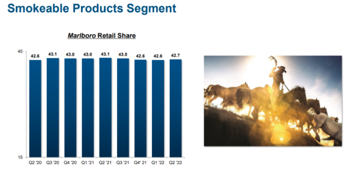 흡연 가능한 담배 제품은 여전히 Altria의 수익과 이익의 대부분을 차지합니다. 말보로 브랜드는 여전히 미국 시장에서 최고의 시장 점유율을 차지하고 있습니다.