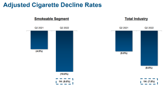 분명히 가장 최근의 2022년 2분기 결과에서 회사는 흡연 가능한 제품 부문이 무역 재고 이동을 조정했을 때 작년에 비해 국내 담배 출하량이 10% 감소했다고 보고했습니다.